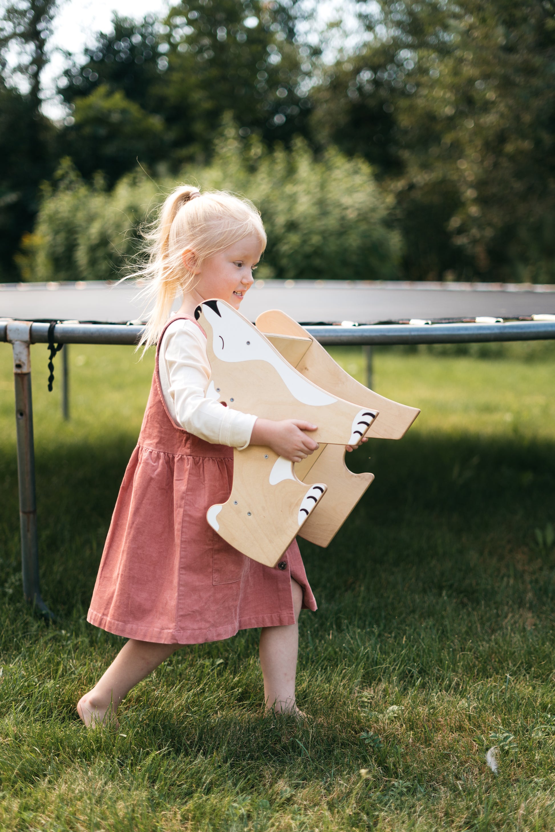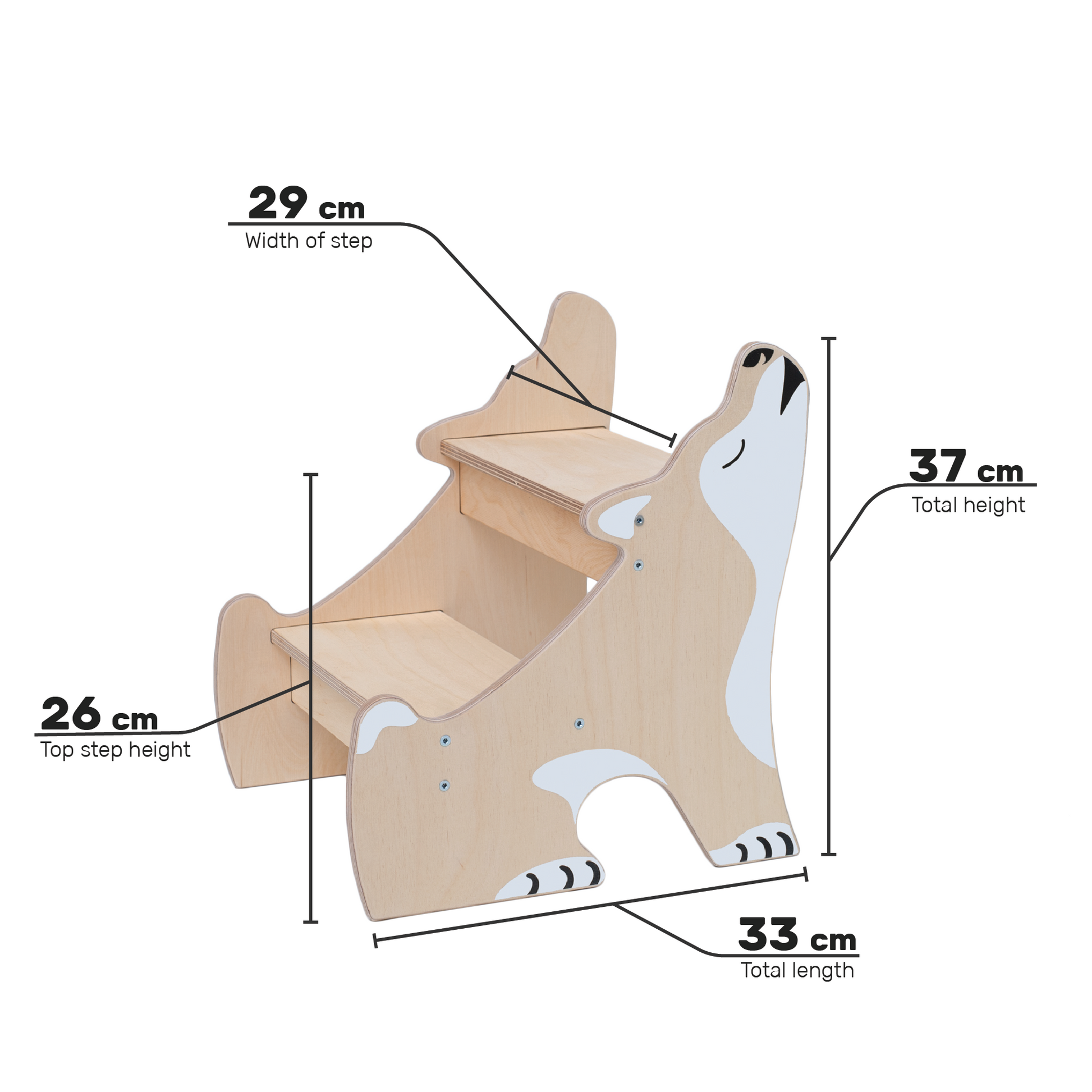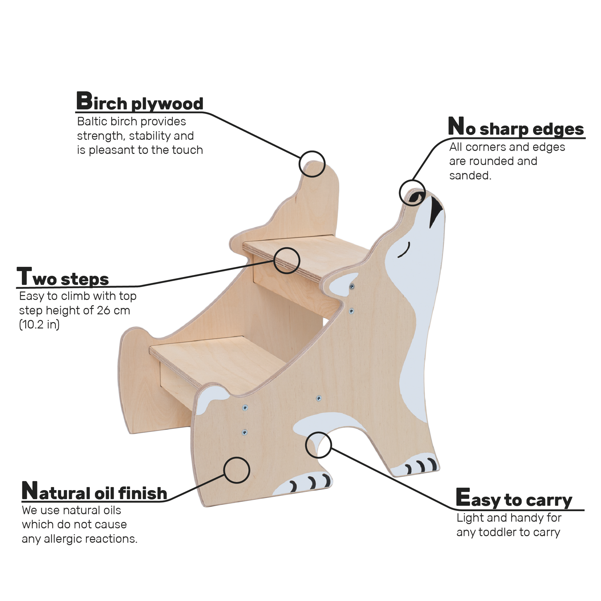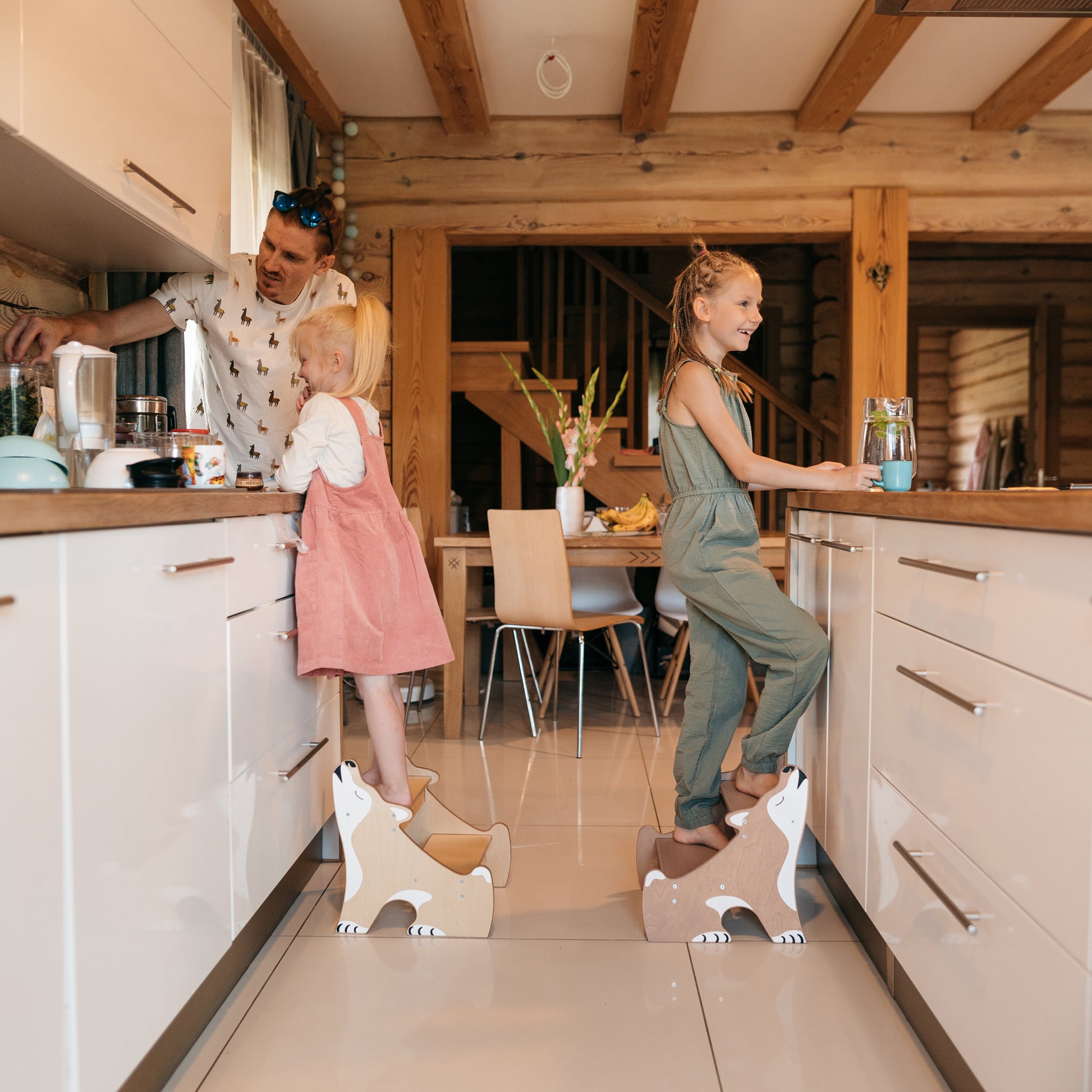 Hunde sind tolle Begleiter und Helfer. Wir haben einen neuen besten Freund für Ihr Kind geschaffen, der es unabhängiger und engagierter bei verschiedenen täglichen Aktivitäten machen wird. Unser Tritthocker ist leicht genug, damit Kleinkinder ihn überall hin mitnehmen können – Küche, Bad oder sogar die oberste Schublade, die zuvor tabu war.
