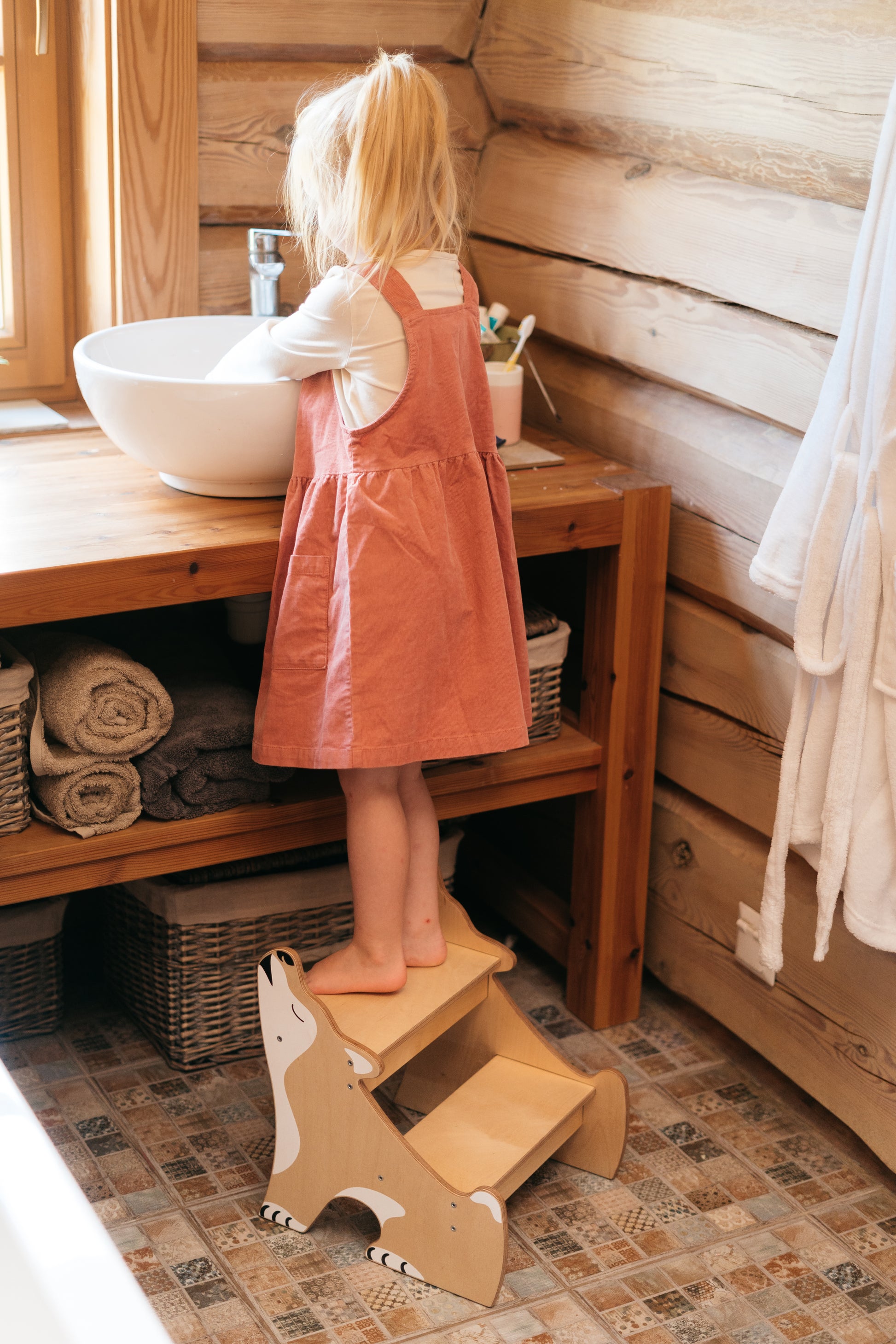 Leicht und handlich für jedes Kleinkind zu tragen, kann dieser Tritthocker als Helfer für Kinder in Bad, Küche, Schlafzimmer oder Kinderzimmer verwendet werden.