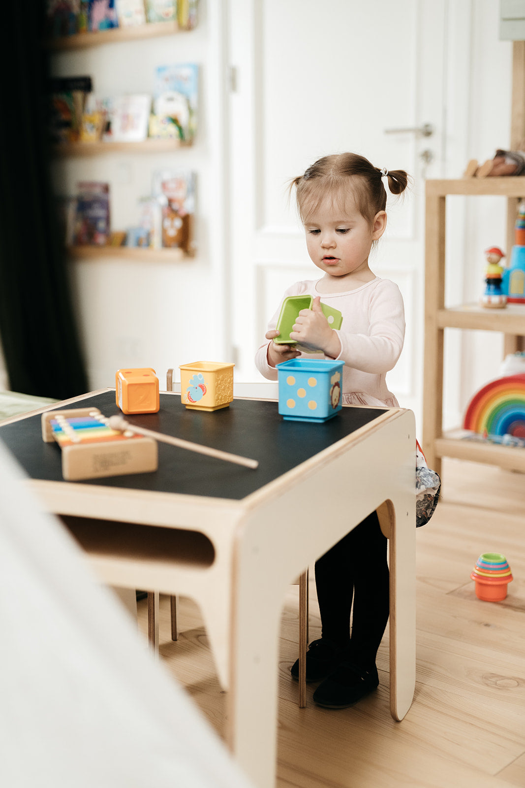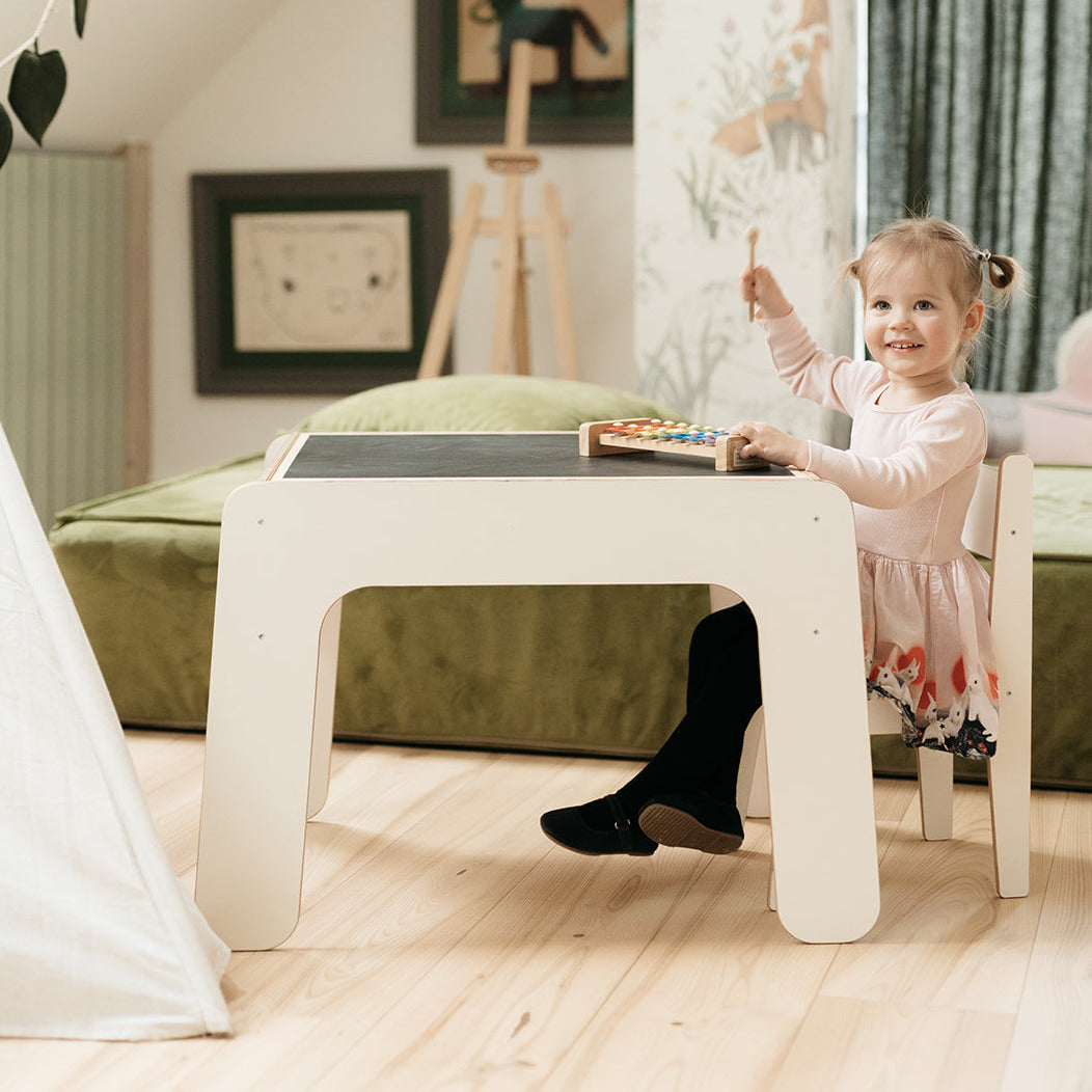 Unsere Tische und Stühle sind für Kinder ab 2 Jahren konzipiert. Die Stühle sind robust genug, um ein Gewicht von 100 kg zu tragen und können auch von den Eltern verwendet werden.