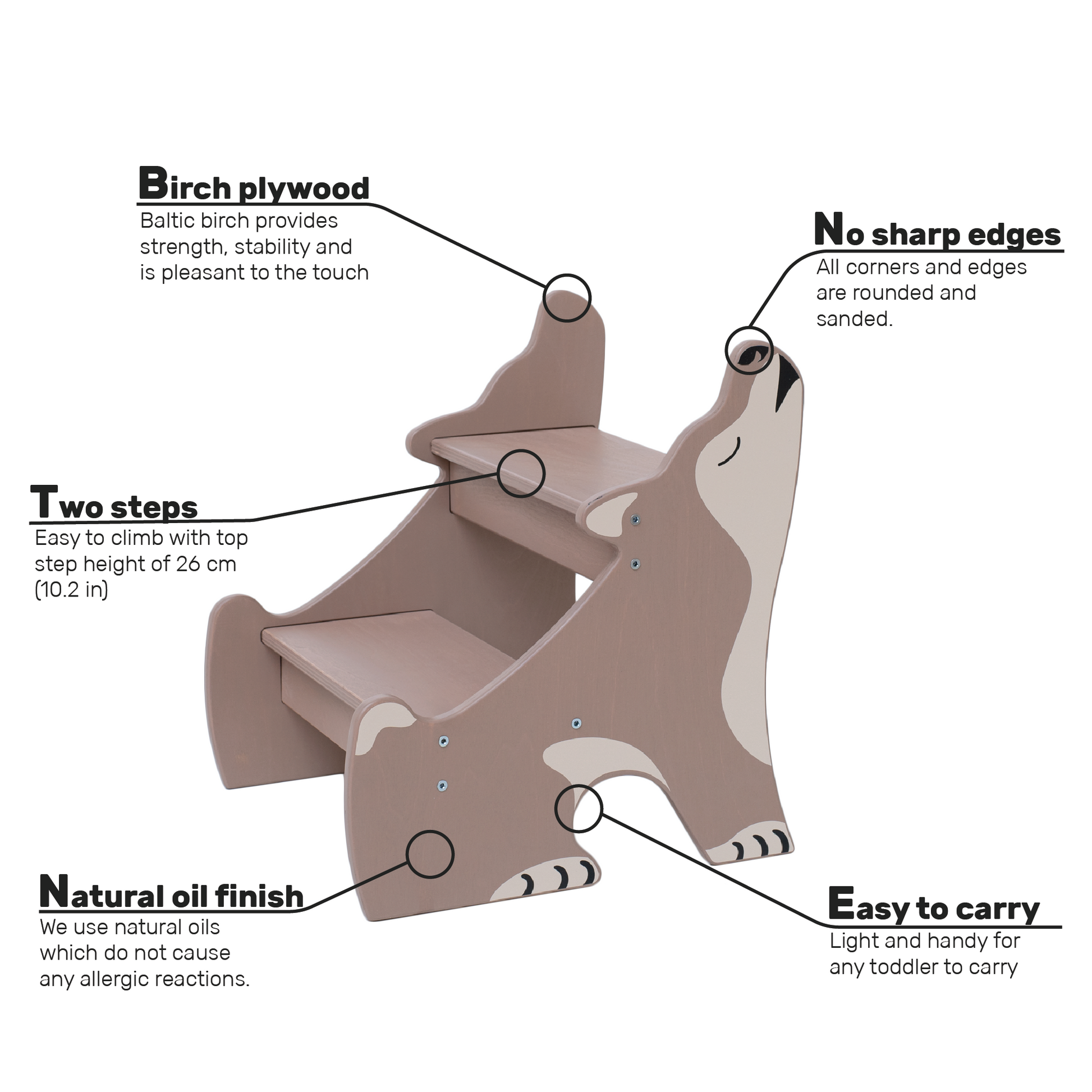 Dogs are great companions and helpers. We have created a new best friend for your child, who will make them more independent and engaged in various daily activities. Our step stool is light enough for toddler to carry it anywhere necessary - kitchen, bathroom or even that top drawer that has been off-limits before.